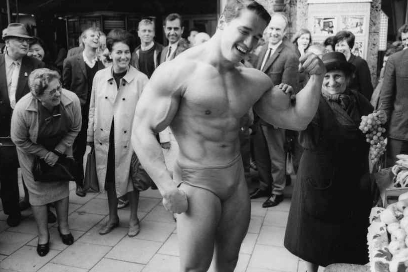 Arnold showing off his muscles to old ladies in Munich, 1967.