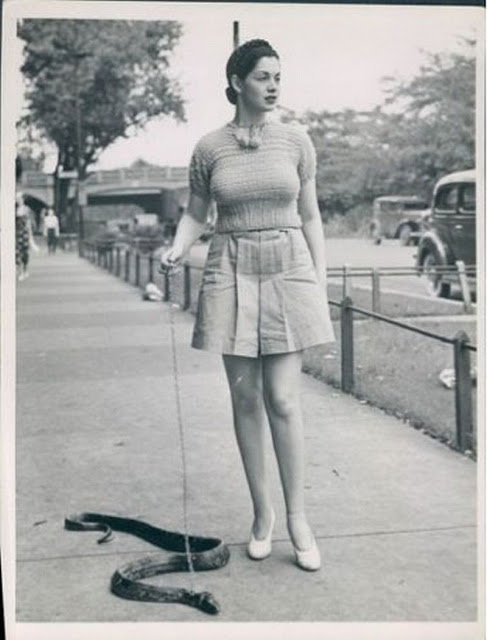 Burlesque dancer, Miss Zorita walking her snake, 1940s.