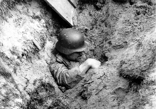 German soldier trying to dig himself out after being buried after a bombardment, Normandy, 1944.