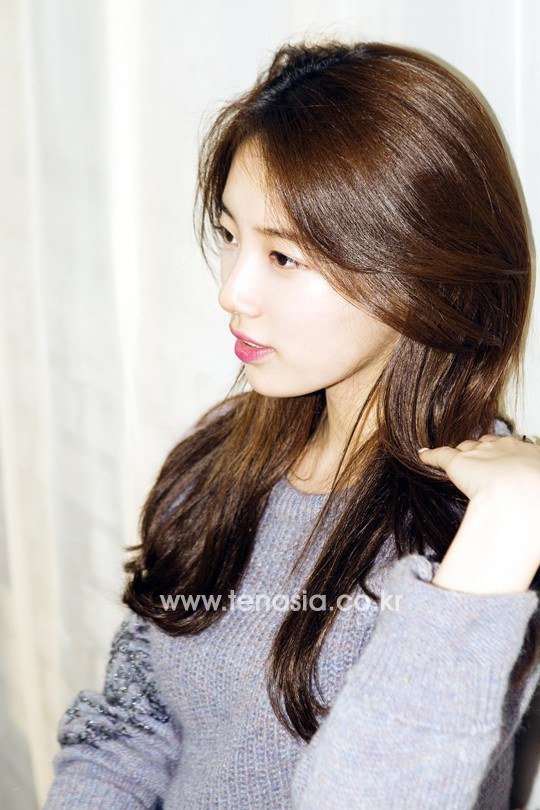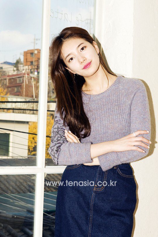 Tenasia has met with Suzy today for an interview regarding her role in the movie "Dorihwaga". The location is in a cafe in Seoul and Suzy appeared in a very casual attire: denim skirt, gray sweater and brown heels.