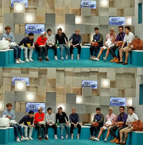 The two photos show g.o.d members Son Hoyoung, Joon Park, and Kim Taewoo with EXO for the latter's new show 'EXO 90:2014' 2nd episode.