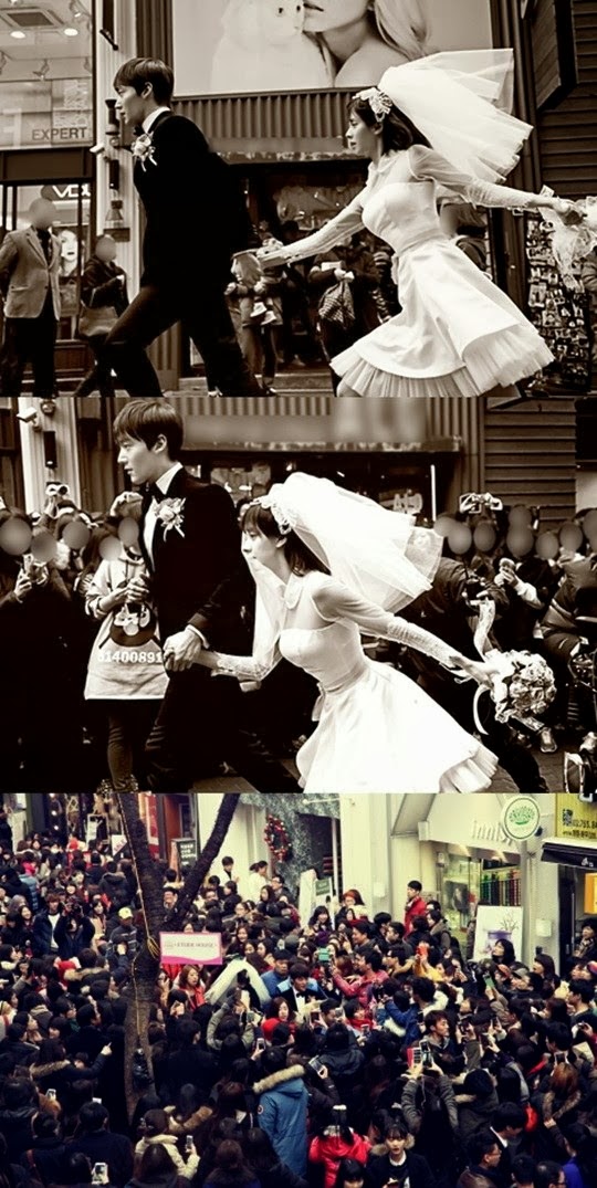 Song Ji Hyo was wearing a white mini wedding dress while Choi Jin Hyuk was dressed nicely in a black tuxedo. Despite being in the cold weather and in the middle of the crowd, both of them showed no sign of tiredness and completed the filming in safety.