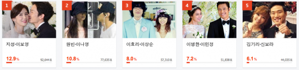 The no.1 spot is none other than Ji Sung - Lee Bo Young who just got married to each other back in September. No.2 belongs to Won Bin - Lee Na Young, they recently revealed they have been dating since August,2012.