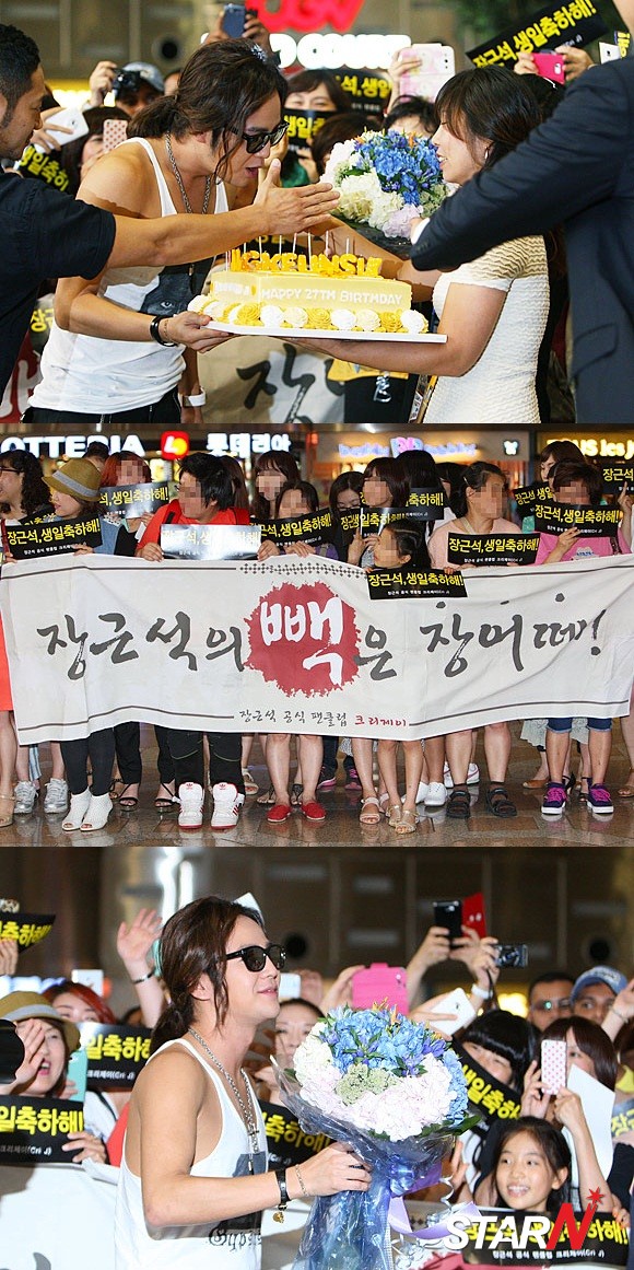 Jang Geun Suk’s fans expressed their love by throwing a surprise party for their idol. On August 1, Jang Geun Suk was scheduled to depart for Japan to officially launch his new fashion brand ‘ZIKZIN’ and his fan club members prepared a surprise birthday party at Gimpo International Airport. Approximately 2,000 fans gathered at the airport from an hour prior to Jang Geun Suk’s arrival. They surprised him with presents such as flowers and birthday cake, and wished him a happy birthday with a birthday song. Meanwhile, Jang Geun Suk will hold the ‘Zikzin Festival’ to promote his exclusive brand ‘ZIKZIN’ through an expo to be held from August 2-4 in Osaka and August 24-25 in Tokyo.
