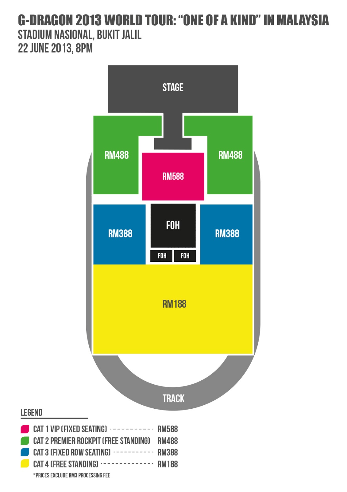 2 May 2013 (Kuala Lumpur, Malaysia) –Co-organisers Running Into The Sun (RITS) and Woohoo! Experience are pleased to announce today that there will be 4 ticket categories at RM588, RM488, RM388 and RM188 for the G-DRAGON 2013 WORLD TOUR: ONE OF A KIND IN MALAYSIA concert. Since the announcement of G-Dragon’s maiden solo concert in Malaysia, fans and media alike have been abuzz with anticipation about the staging of the K-Pop maestro’s show; to help cope with the expected rush for tickets when they go on sale, a special ticket launch event will be held on 11 May 2013, 10am – 5pm at fahrenheit88.