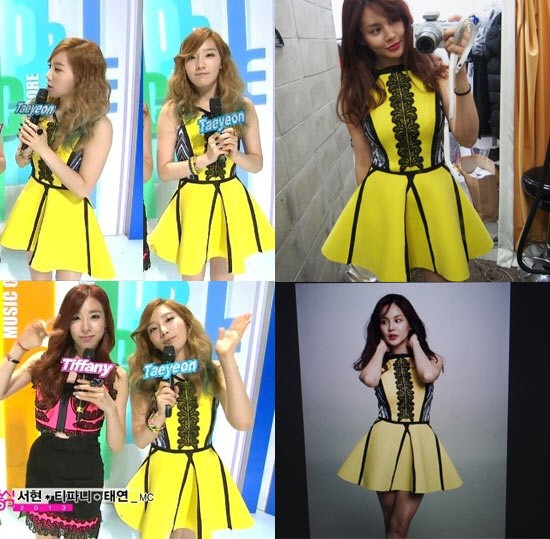 An online community recently uploaded a photo with title,"Taeyeon and IVY:same style,different feeling". In the photo, both Taeyeon and IVY are seen wearing a lemon yellow unique design dress.