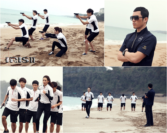 On February 9th, the production team of ‘IRIS 2’ revealed the photos showing actress Lee Da Hae, B2ST’s Yoon Doojoon, Baek Sung Hyun and other trainees getting trained on a shore. While Jang Hyuk, who appears as their trainer, is seen strictly watching over them.