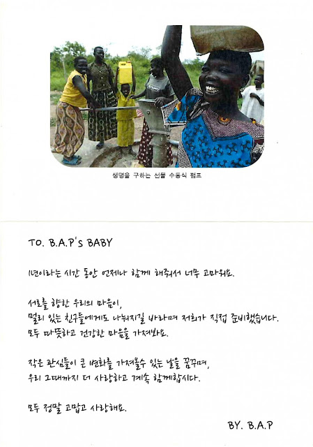 According to the group’s label, TS Entertainment, B.A.P has donated a water pump in Africa under B.A.P’s fan club name to commemorate the group’s one-year anniversary on January 27th.