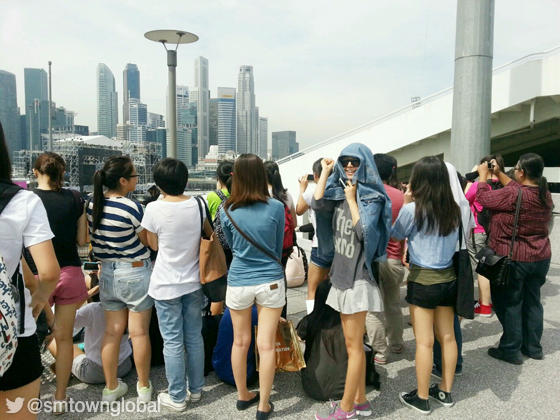 In the photo, Yuri is wearing black sunglasses and hides her face around with a denim jacket. Yuri poses cutely at the camera as she hid among the crowd watching other SM Entertainment stars rehearse for Singapore concert.