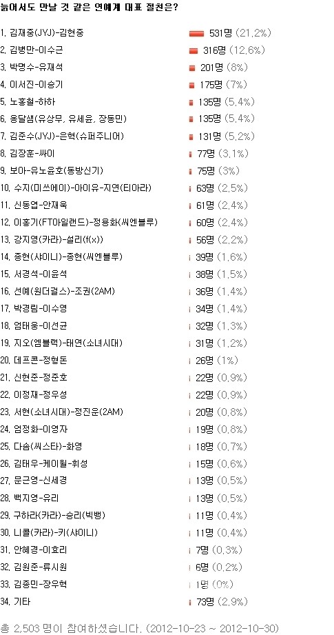 Kim Jaejoong and Kim HyunJoong who have once lived together for a certain period previously, took the first place with 531 votes out of 2503 votes (21.2%) in the poll. The two best friends who have developed their friendship since their debut revealed in broadcast (MBC’s K-pop Star Documentary) that when they were facing hardships, they often write letters of encouragement to each other, which then received a lot of envy for their friendships from the netizens.