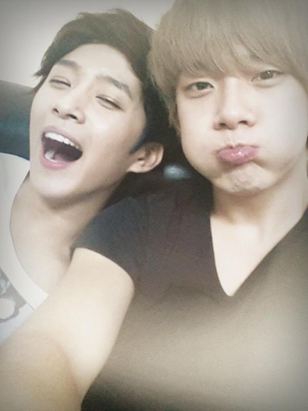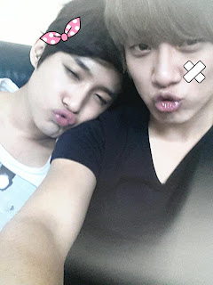 What is more amusing is that, the two are posing so cutely. Somehow their poses display their intimacy (not to mention the cute stickers) Jaejin leaning closely to Minhwan's shoulder while pouting. Minhwan is also pouting with fierce looking eyes.