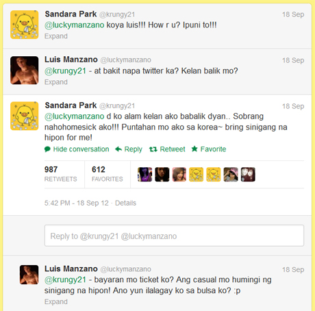 VJ Luis, in response with the tweet, asked Dara why she decided to create a Twitter account and when she'll visit the country again. She replied, "I dont know when I will be coming back. I'm so homesick. Visit me here in Korea~bring shrimp sinigang for me!"