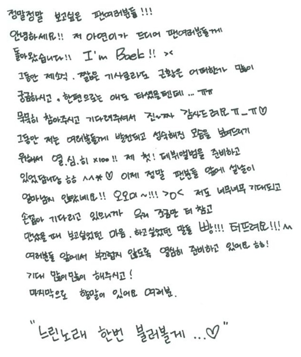 On September 4th, the Baek Ah Yeon posted a photo of the letter on her Twitter and wrote, “Hello to all of my lovely fans! Hi! Ah Yeon is finally back for you!”