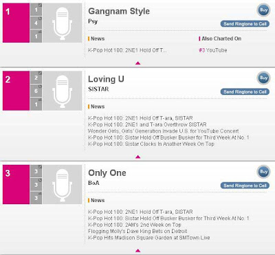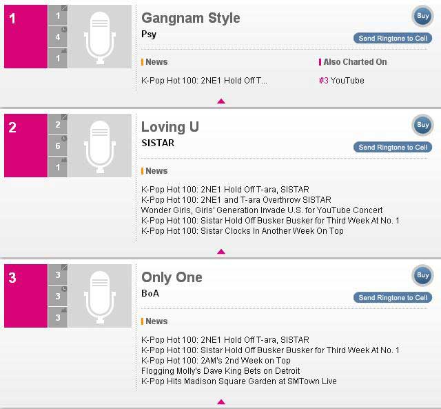 According to Billboard’s latest chart, Psy’s latest title track “Gangnam Style” extended its domination, cementing at the top of the ‘K-Pop Hot 100’ chart for three consecutive weeks. Trailing behind him are SISTAR’s “Loving U” and BoA’s “Only One” which remained at second and third spot respectively.