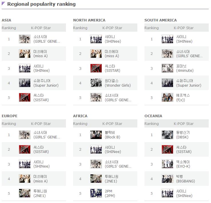 SHINee also ranked in the #1 spot in a chart of artists by country (seen below), placing first within the regions of North and South America, as well as second in Africa.