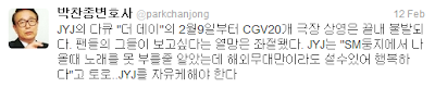 [TRANS] JYJ's documentary 'The Day”'which is scheduled to be shown in 20 CGV theatres on Feb. 9 has fallen through. Fans' desire to see JYJ has been dashed. JYJ expressed that they know they cannot sing after separating from SM and they are happy even though they can only perform on overseas stages.. JYJ should be freed.