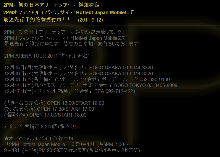 The details of 2PM’s first arena tour are confirmed! At 2PM Official Mobile Fansite・Hottest Japan Mobile is the in middle of and the first to accept reservation orders! We are anticipating for everyone’s participation!