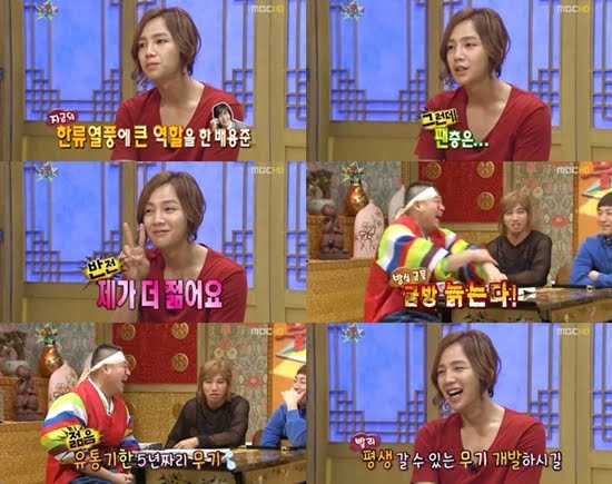 Jang Geun-seok mentioned in the first part of his appearance that his better point compared to Rain was 'youth' and on the second part, 'young fans' when asked about Bae Yong-joon.