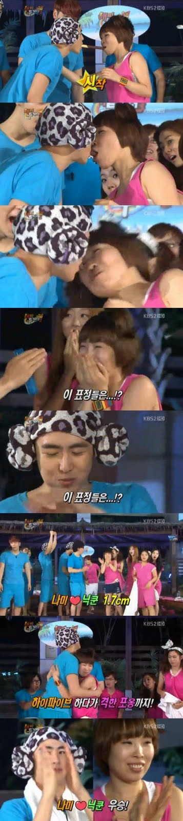 On the August 4 episode of KBS’s variety show Happy Together Series 3, the invited guests included 2PM, After School, Dalshabet, and comedian Oh Nami. They were paired up to play a “Pe Pe Ro game,” a well-known romantic game in Korea: Two members of each team hold a piece of Pe Pe Ro, a thin chocolate bar, in their mouths and then approach each other as close as they can.