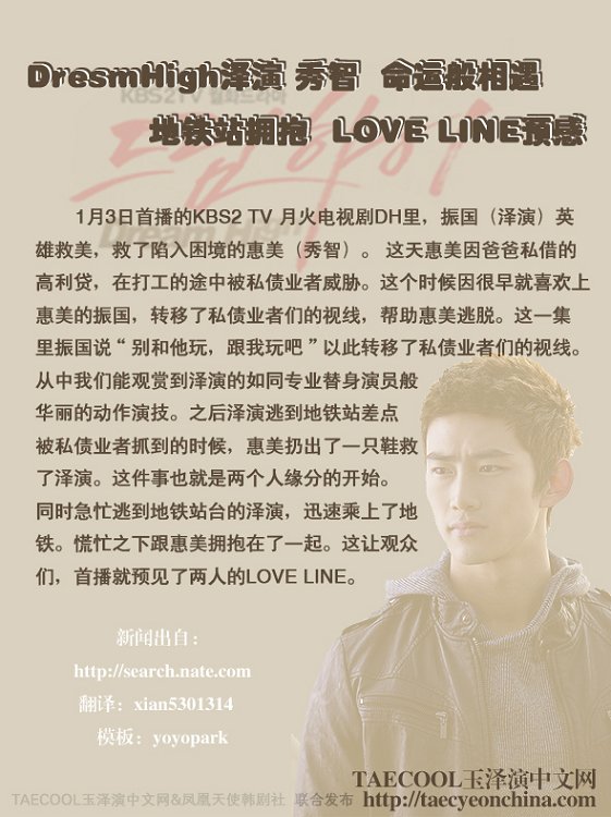 In the hot drama Dream High aired on January 3rd on KBS2 TV, Jin Gook (Taecyeon) the hero who saves the damsel, helps Ko Hye-Mi (Suzy) through a difficult time. On this day, Hye-Mi was at work when a bunch of men that her father borrowed a heap of money from came to threaten her. At this time, because Jin Gook already had a crush on Hye-Mi, he distracted the men's attention away from her, allowing her to escape. In this episode, Jin Gook said to them "Don't play with her, play with me" to distract their attention. From this scene, we can admire Taecyeon's own professional stunts that appear to be done by a stunt actor. <=(meaning, he did them himself). When Jin Gook runs to the train station and is almost caught by the men, Hye-Mi throws out a show and saves him. This moment is also the start of their fate. Both the frantic Jin Gook and Hye-Mi board the train, and in their relief hug each other. This causes viewers to apprehend the "Love Line" that will occur between these two.