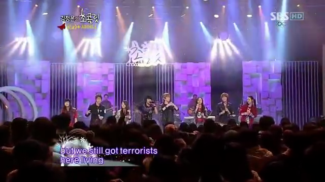 f(x) and SHINee performed together on the show.Luna and Onew sings "Beauty & The Beast" on the show,Victoria shows off her flexibility and the boys and girls performed "Where is the love" together!