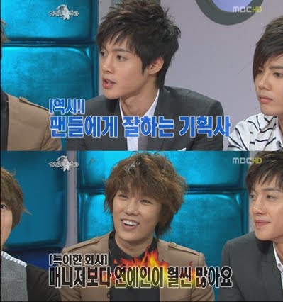 “If the management company is not going to dump me, I want to continue to stay. Actually, they have not contacted me yet.” Leader Kim HyunJoong said making the others laugh.MC Shin JungHwan then joked “The scary thing about the company president is that he is ex-Taekwondo athlete”, making the studio drown with sea of laughter.