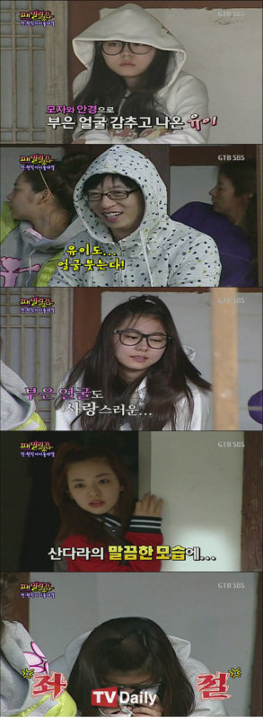 But her embarrassment did not end there, because Sandara Park appeared at that moment, looking no more different from the way she usually looks. Her face looked undisturbed, and did not appear swollen, and UEE even asked her about it, making all of them laugh.