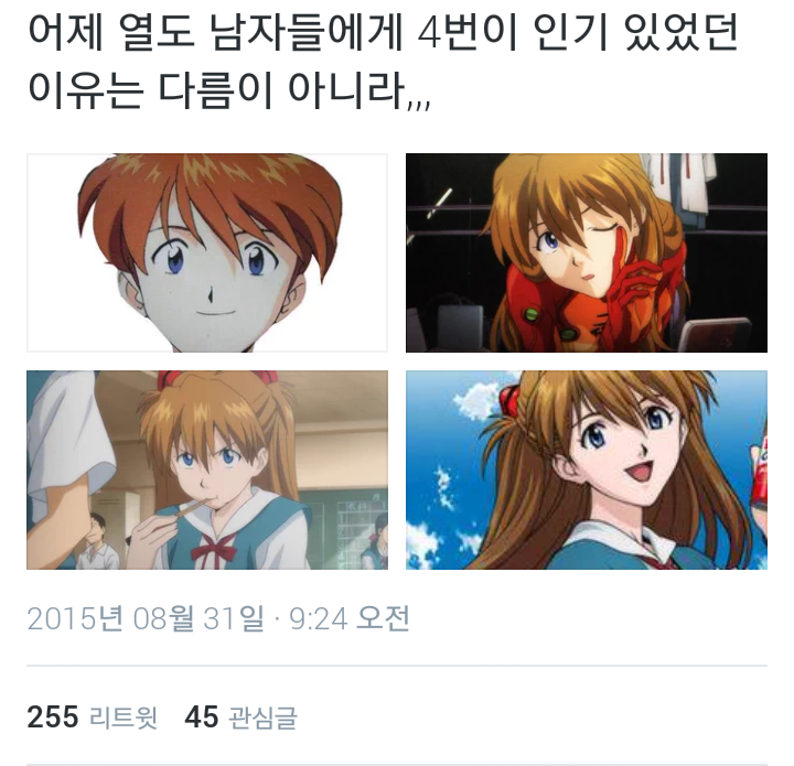 A post from instiz introduces us to the male version of Asuka Langley Soryu from a hit anime series "Neon Genesis Evangelion". In a photo comparison, we can really see quite resemblance of Baekhyun to the female character but netizens even photoshop the image and made her long hair shorter that of a boy and poof! Baekhyun's cartoon image emerges!