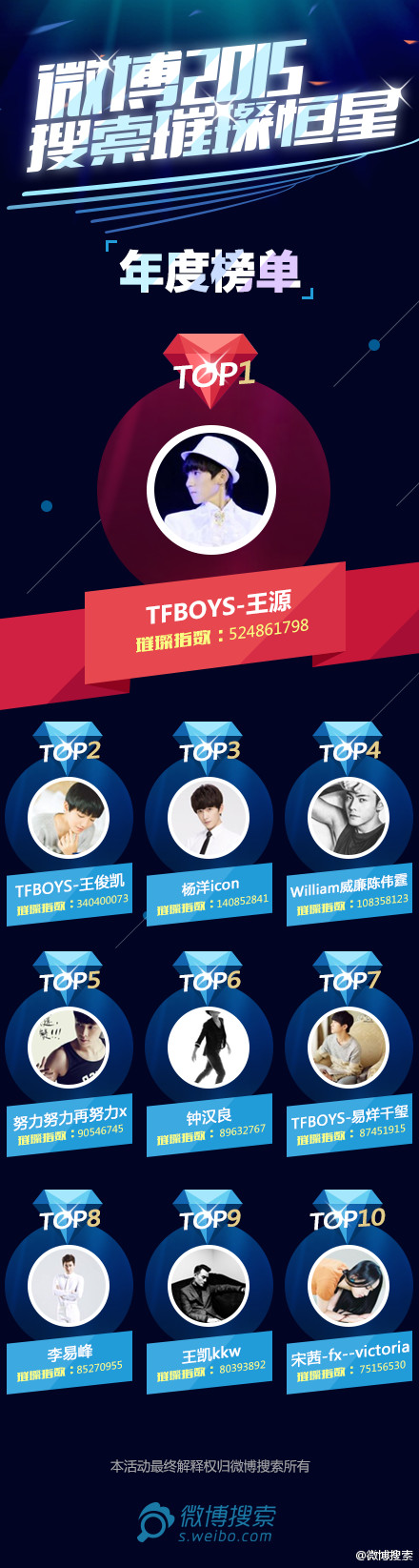 Weibo reveals a list of 10 most searched stars in 2015, EXO's Lay is ranked at 5th place and Victoria is the only female star in the list, congratulations!