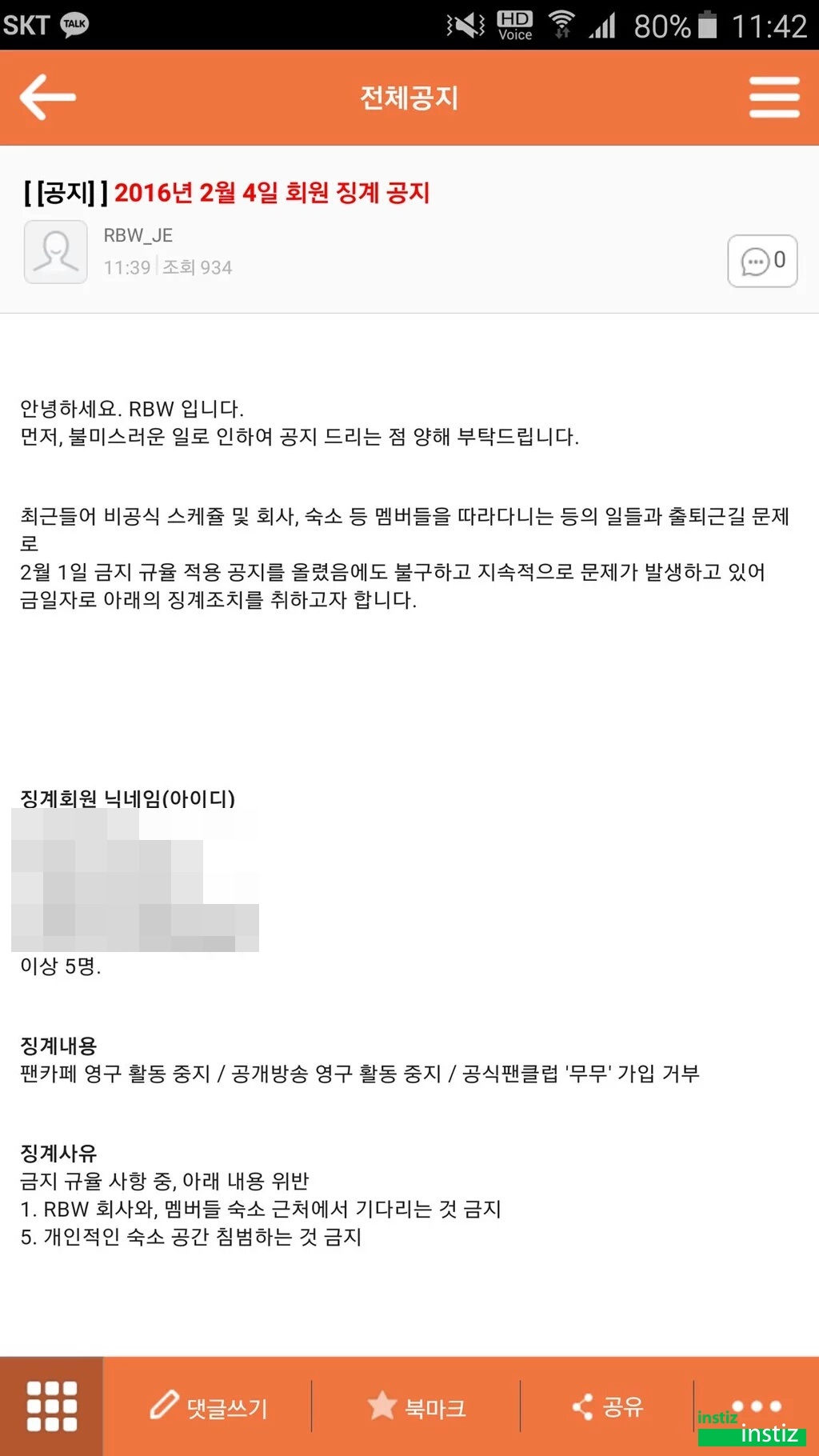 RBW listed the 5 fancafe IDs of the stalkers involved and revealed the corresponding punishments and their reasons. This includes the permanent ban from Mamamoo's official fancafe, attending the group's public broadcast and activities, and denying from becoming an official MooMoo.