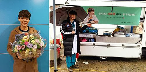 In regards to this, Minho uploaded some photos of him showing the fans' support and wrote on their me2day, "Everyone, everyone I was thankful~^^" In the photo, Minho is showing the food support with his banner. In the other photo, he was holding a basket of flowers as a congratulatory wreath for the successful drama.