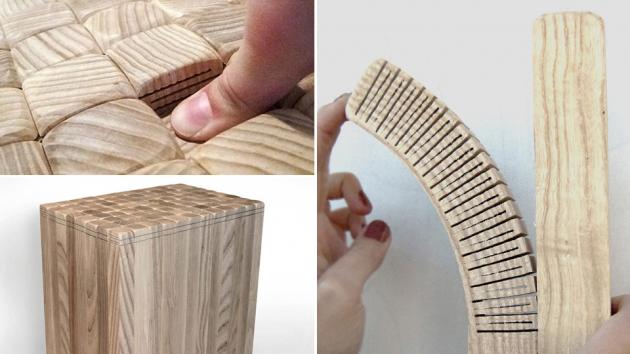 The stool was made by vertically grouping long pieces of plyable ash wood that were notched to compress under pressure. Which means the wooden stool doesn't have any cushion stuffing but is still comfier than it looks.