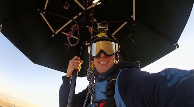 Roner cuts loose from the bottom of a hot air balloon holding an umbrella contraption. It can't be a real umbrella otherwise at that height, it'll break. Check it out below. Exhilarating!