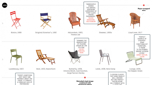 Al fresco seating has got to be comfortable. After all, you're enjoying the natural breeze out along with other pollutants in the air. The New York Times has a retrospective graphic of the styles of seating going all the way back from 1889 to the present.