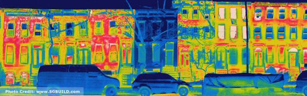 Curbed says that this thermal image was taken on a freezing night in winter and while its neighbors were leaking red and orange heat all over, 23 Park Place which is right in the middle looks completely blue.