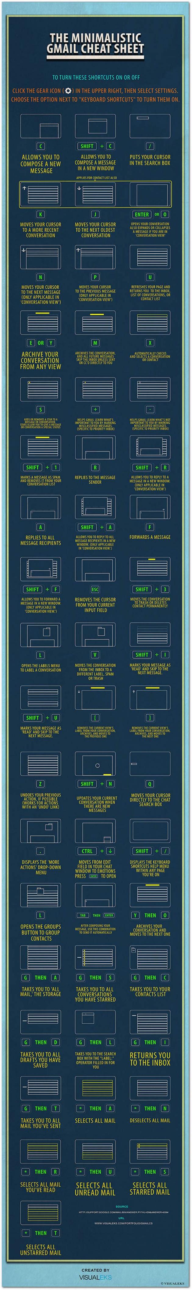 Are you using Gmail? Then you'll like to know there's a whole lot of shortcuts that will cut down some time for you. This http://visual.ly/minimalistic-gmail-cheat-sheet " onclick="window.open(this.href);return false;">graphic has all the keyboard shortcuts and it comes complete with visualizations of each action.