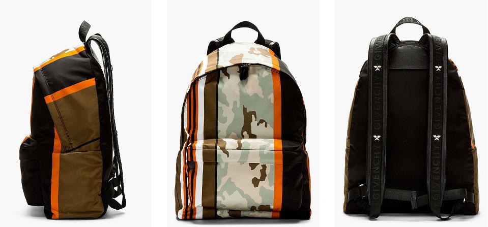 Givenchy presents this latest backpack featuring a mint green and orange camouflage print. The nylon bag features a central camo print panel with mint and orange stripes on either side. The back and base features reinforced panels for durability, while leather and signature silver-tone star studs on the straps. Available now via SENSE