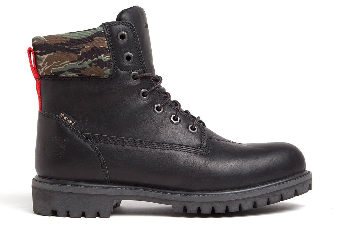 Timberland‘s classic 6-Inch Boot is the canvas for this latest collaboration with New York’s Black Scale. The collection is set to feature three colorways of the iconic boot, and first up is a stealthy black makeup featuring premium black leather paired with a woodland camo collar and red heel tab.
