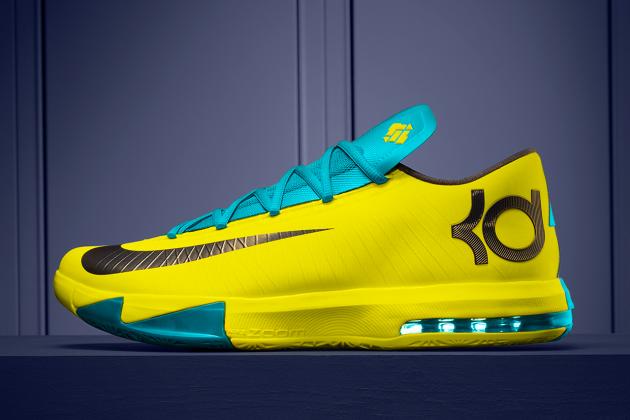 The KD VI is the latest signature shoe between Nike and baller Kevin Durant. These eye-popping kicks feature unique multi-layered outsole, a thin two layer upper with Flywire inserts, a Nike Zoom unit in the forefoot and Max Air unit in the heel, and a new tongue construction for improved fit. The teal and yellow kicks are set to release worldwide at select retailers on July 3.