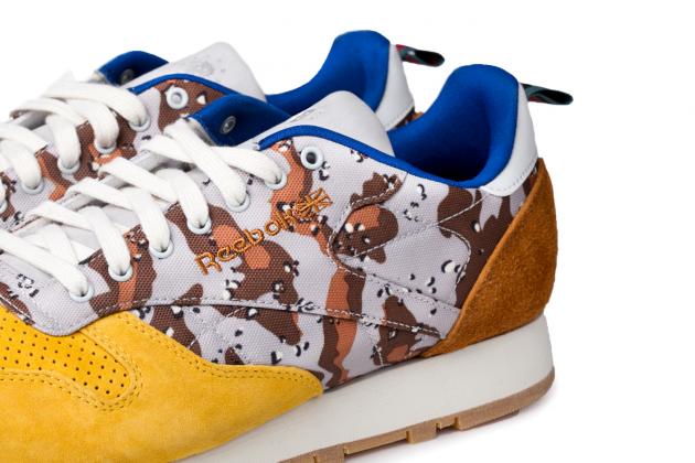 Reebok and Bodega hook up to celebrate Reebok's Classic Leather's 30th anniversary. Three parts of the sneaker's uppers use a mix of mustard yellow suede at the toe, followed by a canvas mid in desert-camo and brown suede heel.