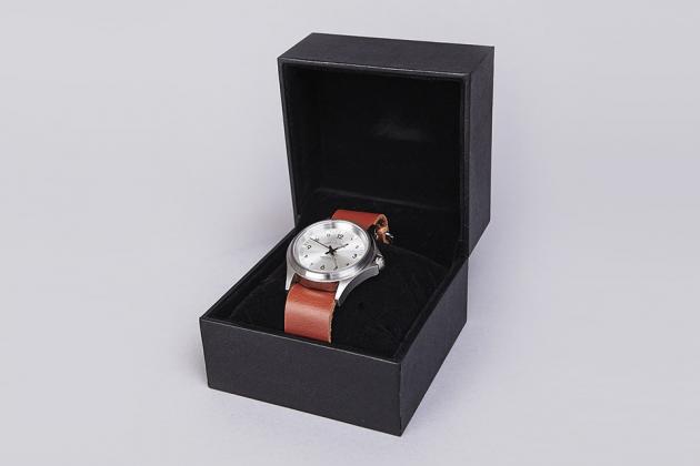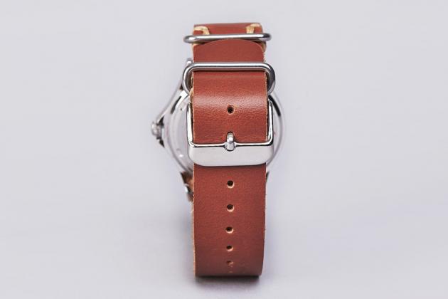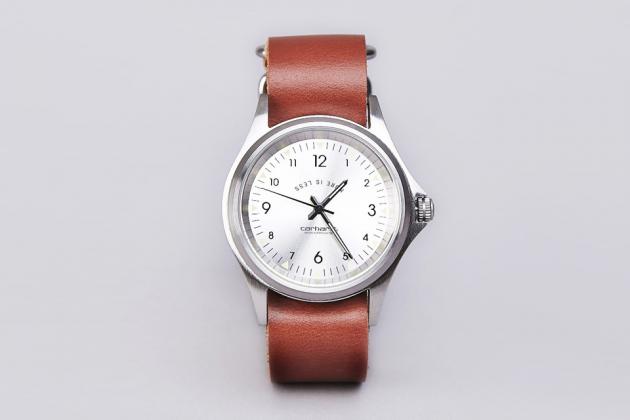 Carhartt's latest variation on the classic military watch is constructed of brushed steel, and a brown leather strap with the words "LESS IS MORE" written upside down to add an interesting twist to the timepiece. Available now at Flatspot: