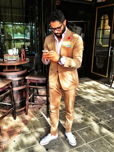 2. Converse Cool Nothing beats a pair of clean canvas sneakers from Converse. The key to pulling it off is to keep it simple with the colours. The gentleman in photo above decided to pair his white chucks with a caramel brown suit, finishing with pop of red on the lapel. And be sure to keep those 'chucks' crisp and clean to keep it casual yet classy.