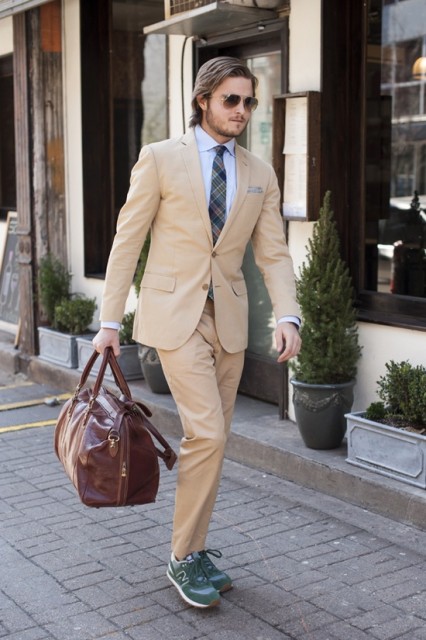 3. Seriously Sporty The great thing about chino-style cotton suits is that they're casual enough not to look overdressed, yet stylish enough to wear for any smart occasion. And if you're really going for comfort, why not team it up with a pair of New Balance trainers in a complementary colour?