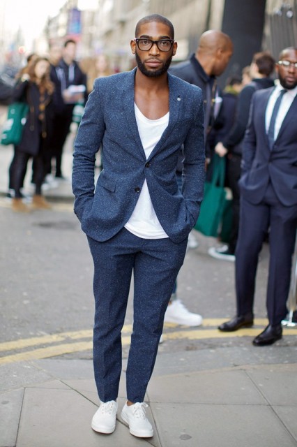 4. Keep It Casual Now this is how you balance between casual and formal. The gray suit keeps it dressy while the pristine white tee and matching plimsolls will leave you feeling exceptionally comfy. It really is the perfect go-to everyday/every night kinda outfit.