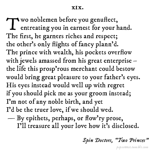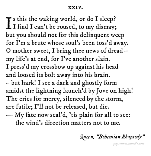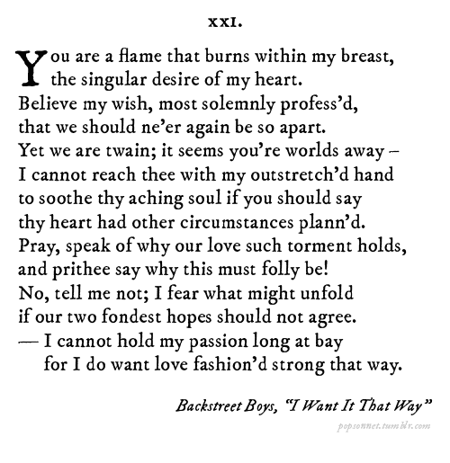 Most song lyrics don't make sense, so what happens if they were rewritten as sonnets instead? The guy decided to do just that, and it may seem old-ish, but they probably made the songs sound a whole lot more...meaningful.