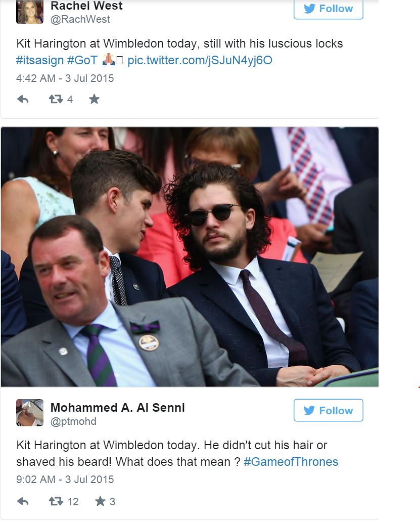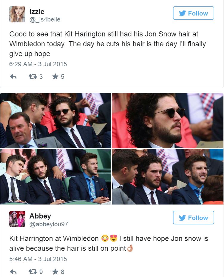 Kit Harrington attended Wimbledon today but that's not really the big headline you should be taking notice. What you should be taking notice is his hairstyle. His Jon Snow hairstyle. So why is this important you ask? Spoilers below. Be warned!