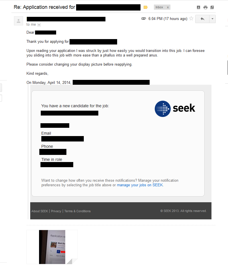 A guy sent out his resume but wasn't getting any response, until the HR person from one office sent the reason why no one was calling him back. He forgot to check something that was really important.