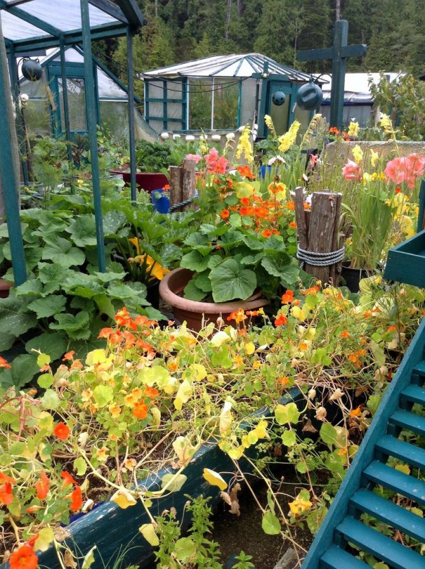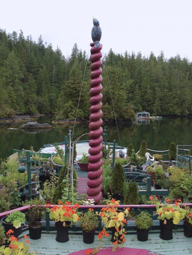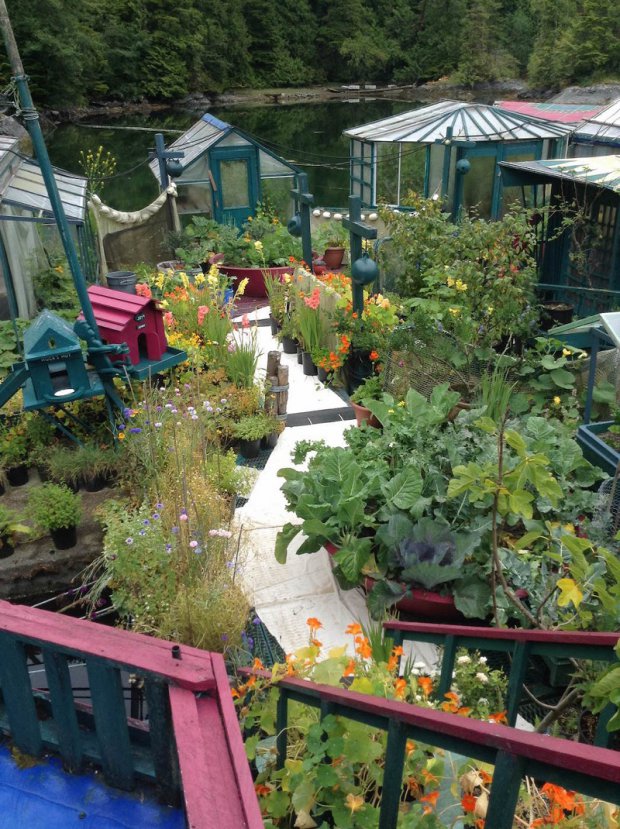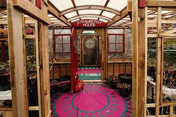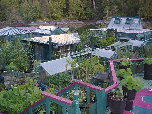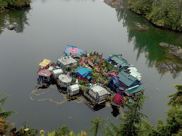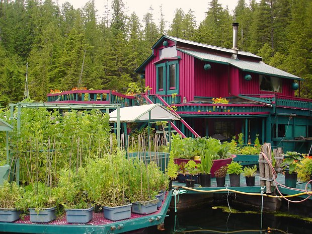 The island features greenhouses, an art gallery, and a lighthouse tower, all of which use recycled materials and painted bright shades of pinks and purples. Food is grown on expansive gardens and it harnesses the sun's energy using solar panels.
