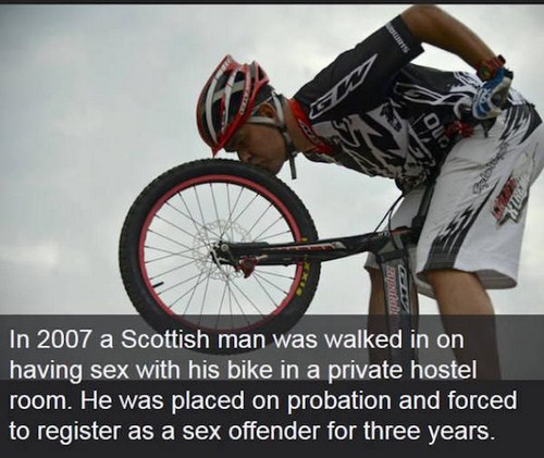 2. A Scottish man was walked in on having sex with his bike in a private hostel room. He was forced to register as a sex offender for three years.