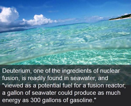 3. Deuterium, is one of the ingredients of nuclear fusion, and is found in seawater. A gallon of seawater could produce as much energy as 300 gallons of gasoline.